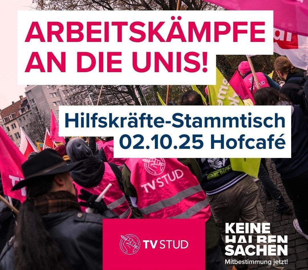 Genau das, die Forderungsfindung und den politischen Ausdruck organisieren studentische Beschäftigte und dafür laden wir euch zur Vernetzung am 02.10.25 um 18:00 Uhr ins Hofcafé ein. Das erste Getränk geht auf uns.